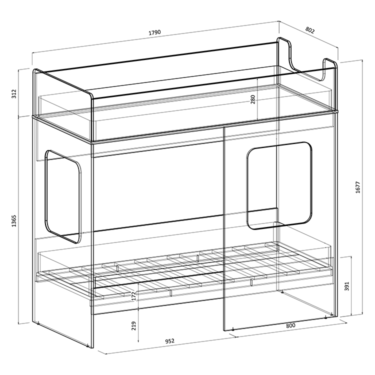 Прямоугольные световые окна обеспечивают дополнительное освещение, а фронтальная стенка создает ощущение домика для Ваших детей.